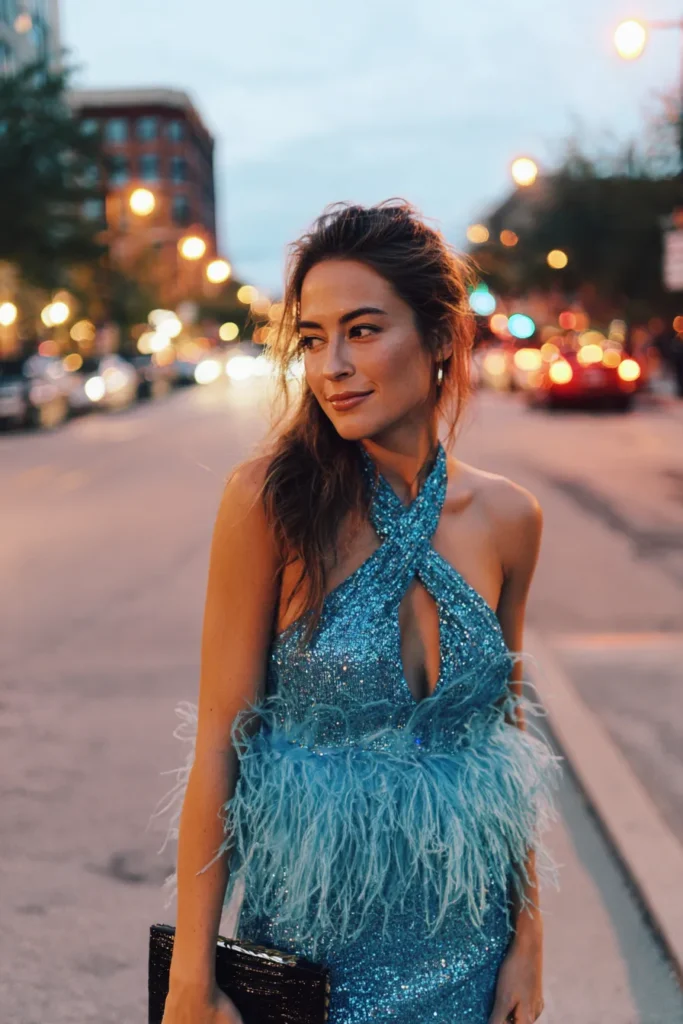 This outfit brings a burst of playful glamour with a sparkling blue halter dress that crisscrosses at the neckline and catches the city lights beautifully. The sequins give the fabric a bright icy shimmer and the feather trim around the waist adds a fun and fluffy texture that feels perfect for a festive night out. The color is bold, the silhouette is flattering, and the whole look has that lively party energy that always stands out in photos.
