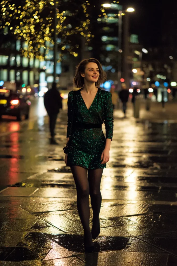 This emerald green sequin mini dress brings such a stunning shine against the city lights. The long sleeves balance the shorter hem in a really chic way and the deep V neckline adds a soft glamorous touch. The sequins catch every reflection on the wet pavement and create this glowing effect that feels perfect for a festive night. Paired with sheer black tights and simple heels, the outfit looks polished without feeling fussy.