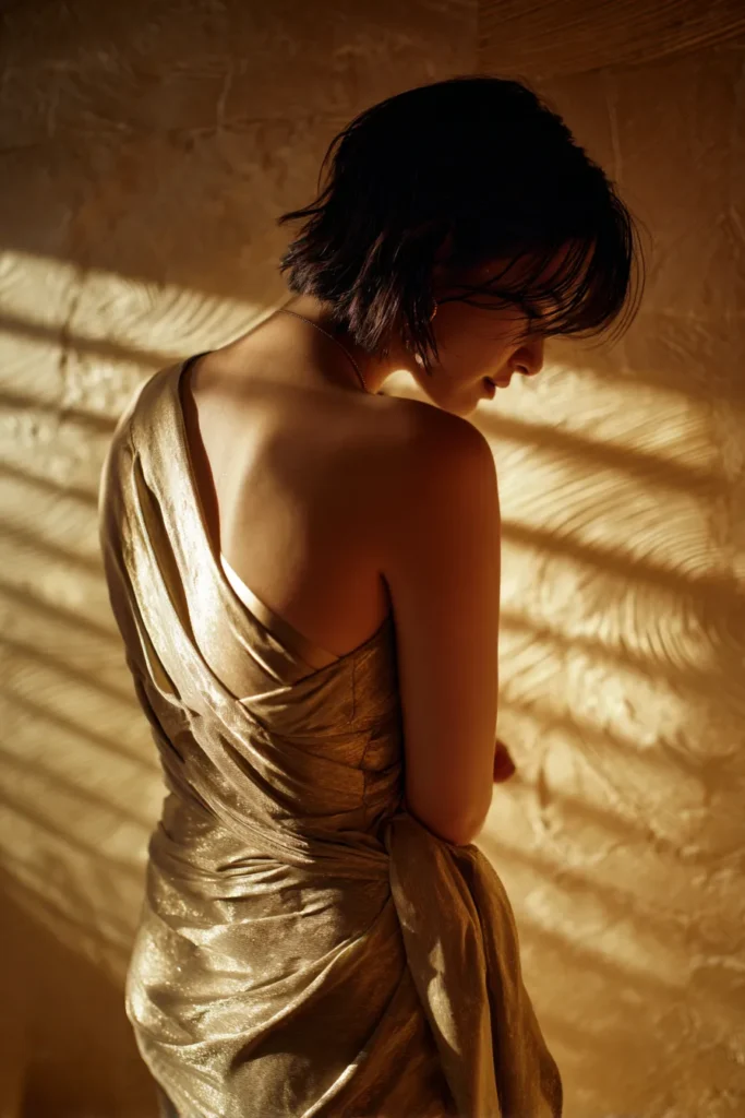 This outfit features a beautiful gold metallic dress with a one shoulder design that drapes effortlessly across the back and waist. The fabric catches the warm light in the prettiest way and the gathered details create a soft sculpted look that feels elegant and dramatic at the same time. The overall vibe is refined and golden with a subtle shimmer that makes the dress feel perfect for a warm and glowing New Year moment.
