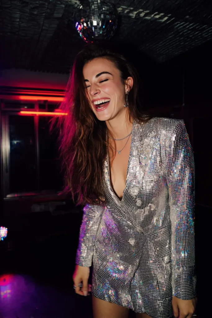 This outfit brings full party energy with a silver blazer dress covered in tiny mirror like tiles that shimmer with every bit of light in the room. The structured shape creates a bold silhouette while the deep neckline adds a fun and flattering touch. The mosaic sparkle feels almost disco inspired and looks incredible under colorful club lighting. Paired with simple jewelry and natural makeup, the dress does all the talking in the most glamorous way.