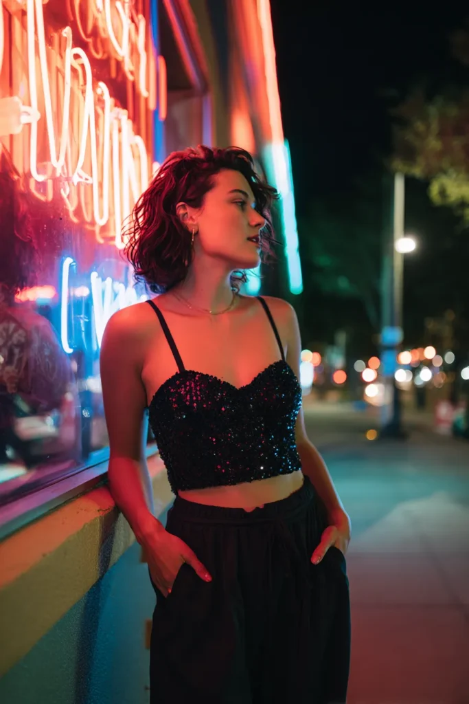 This outfit brings a cool and modern sparkle with a black sequin crop top that glows under the neon lights. The top has a fitted sweetheart shape with thin straps that keep the look simple and sleek while the sequins add a rich glossy shine. Paired with relaxed black pants that have a soft drape and a comfortable fit, the whole outfit feels effortlessly stylish. The contrast between the fitted top and the loose pants creates a balanced and contemporary vibe.