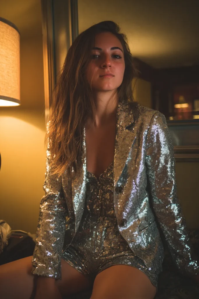 This outfit brings pure sparkle from top to bottom with a silver sequin blazer paired with a matching sequin romper. The blazer adds a little structure and shine while the romper keeps things playful and fun with its fitted neckline and soft shimmer. The silver sequins reflect the warm lighting in the room which gives the whole look a dreamy glow that feels perfect for a festive night. It is a mix of tailored and flirty that works so well for New Year’s Eve.