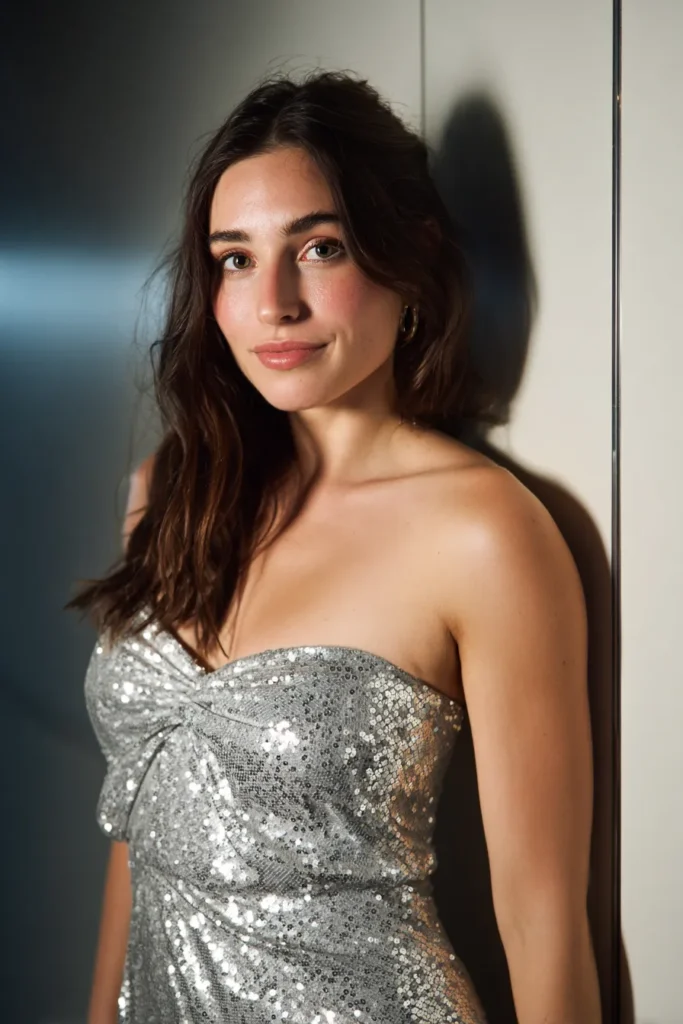 This outfit brings classic sparkle with a strapless silver sequin dress that feels sleek and perfectly festive. The bodice has a subtle twist detail that adds shape and softness while the sequins shimmer in the light and create that Champagne at midnight kind of glow. The strapless neckline keeps the look clean and elegant which lets the sparkle do all the talking. It has that simple but stunning vibe that always works for New Year’s Eve.