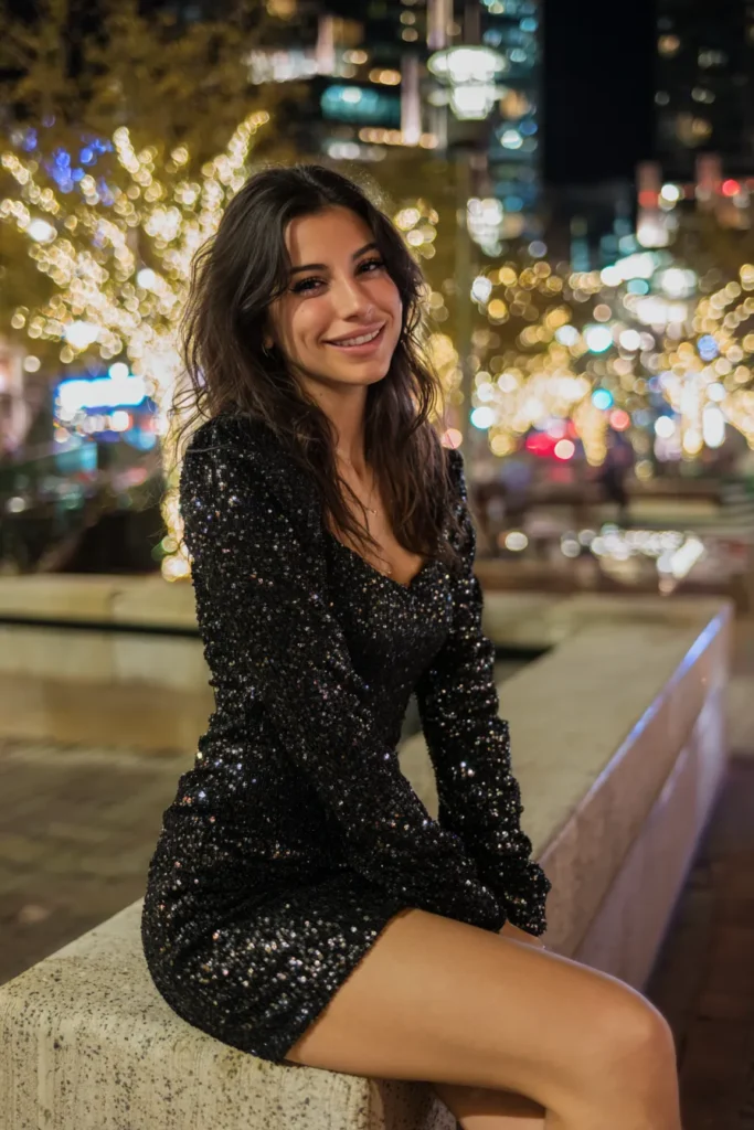This outfit brings a gorgeous mix of chic and festive with a black long sleeve sequin mini dress that sparkles beautifully under city lights. The fitted silhouette feels sleek while the subtle shimmer from the sequins adds that perfect New Year’s Eve magic. The long sleeves balance the shorter hem which keeps the look classy yet fun and the soft sweetheart neckline adds a pretty feminine touch. It is the kind of dress that looks just as stunning in photos as it does in motion.