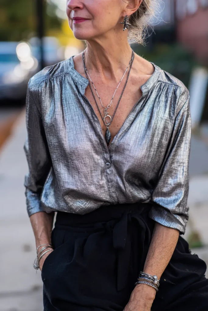 This outfit brings the spotlight straight to a stunning silver metallic blouse with a soft crinkled texture that catches the light beautifully. The neckline has a relaxed shape that pairs so well with the layered silver necklaces, creating an effortless shine. The blouse is tucked into high waisted black pants with a tie waist that adds structure and softness at the same time. A mix of silver bracelets and artistic earrings ties the whole look together with a creative and stylish touch.
