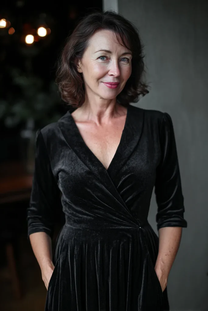 I love this look because velvet always brings that timeless New Year charm without needing any extra sparkle. The wrap silhouette is one of those foolproof shapes that feels good on so many body types and the soft drape makes the dress perfect for an evening of celebrating. It is elegant, classic and quietly glamorous which is exactly what I reach for when I want to feel confident and graceful all night long.