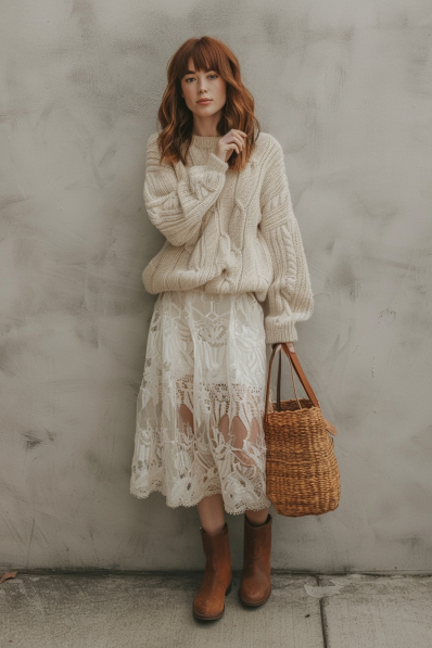 Slouchy Knit Sweater and White Lace Skirt Elegance