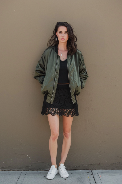 This outfit is all about laid-back, urban style with a feminine twist. The black lace mini skirt adds a touch of softness with its scalloped hem and delicate texture, while the olive bomber jacket brings in a cool, sporty vibe. A simple black crop top underneath keeps it sleek and balanced, and the white sneakers make the whole look feel effortless and wearable.