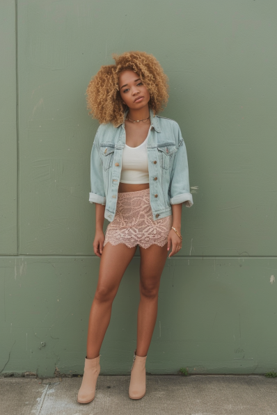This outfit is the ultimate mix of relaxed and chic. The soft blush lace mini skirt brings flirty charm with its scalloped hem and delicate details. Layered with a white crop top and a light-wash denim jacket, the look strikes that perfect balance between effortless and stylish. Finishing it off? Sleek nude ankle boots that elongate the legs and add a polished touch.