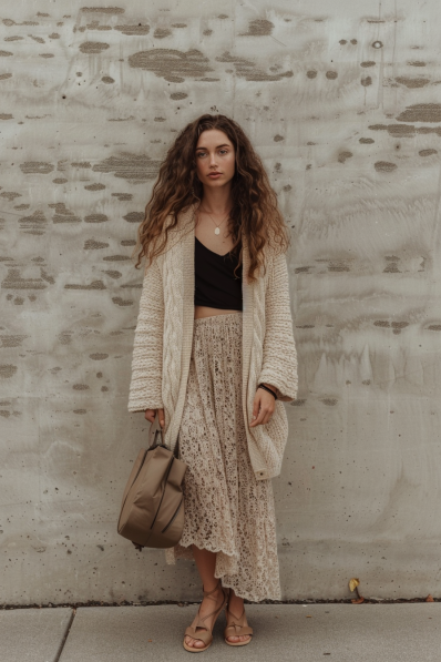 What I adore about this look is how it feels both grounded and dreamy. The lace skirt gives that soft bohemian feel, while the oversized cardigan wraps everything up in a layer of effortless comfort—like you’re ready for a relaxed day wandering through an art fair or sipping tea in a cozy nook. It’s practical but has that free-spirited touch, perfect for those days when you want to look elegant without even trying.