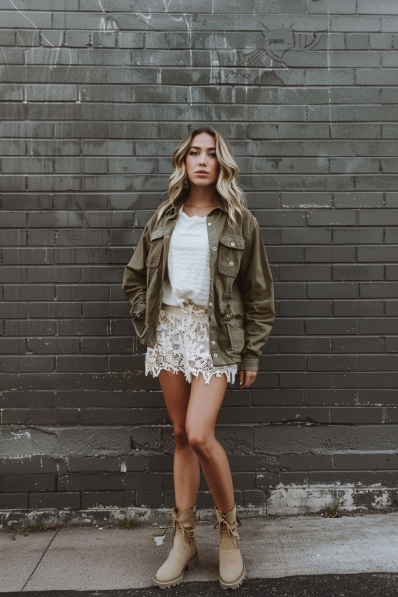 Edgy Utility Jacket Meets Feminine Lace Skirt