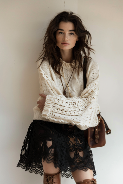 I’m obsessed with how this outfit plays with contrasts—it’s like snuggling up in your favorite sweater while looking ready for a magazine shoot. The chunky knit feels warm and relaxed, but the black lace skirt? That’s where the magic happens. It’s flirty, feminine, and just a little daring, which I love. And let’s not forget those boots—instant confidence boost, right? Honestly, I’d throw this on for a casual brunch or an artsy day out because it’s comfy yet so on point.