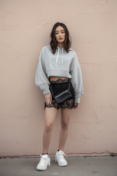 This outfit is the ultimate mix of laid-back streetwear and edgy feminine style. The cropped grey hoodie brings a sporty, relaxed vibe, while the black lace skirt adds an unexpected, flirty contrast. The bold lace detailing gives just enough attitude, and paired with chunky white sneakers, it’s equal parts comfortable and cool. Topped off with a sleek black crossbody bag, this look is modern, effortless, and totally Insta-worthy.