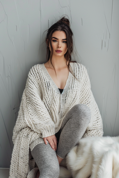 What I love about this outfit is how effortlessly chic it feels. The oversized cardigan makes it look like you’ve wrapped yourself in the softest blanket, but it still manages to feel put-together. Paired with leggings, it’s comfy enough to lounge in all night but stylish enough to snap a cute picture without a second thought. Perfect for those evenings when you want to stay cozy but still feel a little glam.