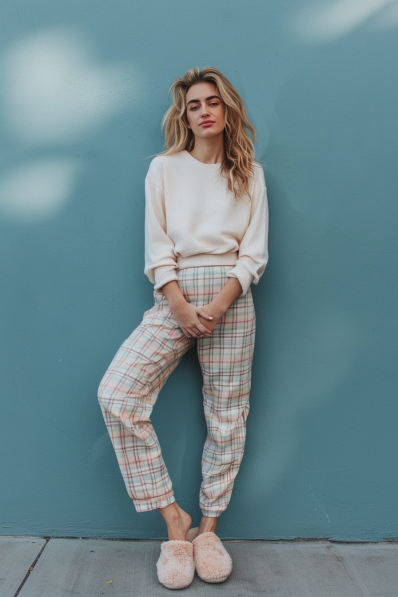 What I love most about this look is how effortlessly cozy it feels without looking too laid-back. The plaid pants bring just the right amount of charm, and the soft sweater keeps it feeling light and fresh. Plus, the fuzzy slippers? They’re the perfect finishing touch for a night spent curled up on the couch with your favorite movie.