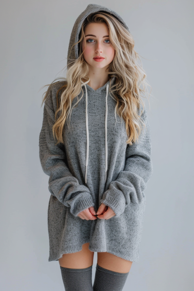 An oversized grey hoodie paired with soft thigh-high socks is the perfect combination for a relaxed movie night at home. The loose fit of the hoodie gives off that effortlessly cool, borrowed-from-your-boyfriend look, while the cozy socks add a touch of warmth and playfulness. This outfit strikes the perfect balance between comfort and effortless style.