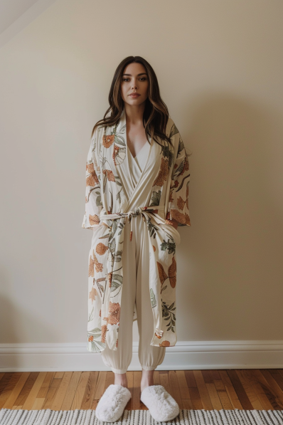 A soft, neutral-toned jumpsuit layered under a beautifully printed robe creates a chic yet comfortable look for a cozy movie night at home. The robe’s delicate pattern adds a touch of elegance, while the jumpsuit keeps things effortlessly relaxed. Paired with fluffy slippers, this outfit brings a perfect mix of style and comfort.