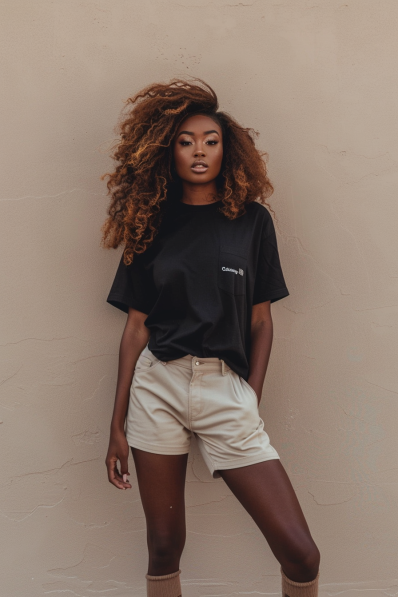 A classic black oversized tee paired with neutral-toned shorts creates the perfect laid-back vibe for a cozy movie night at home. The relaxed fit of the tee adds an effortless touch, while the structured shorts keep things balanced and stylish. With earthy tones and a simple, timeless design, this look is all about feeling comfortable without losing that cool edge.