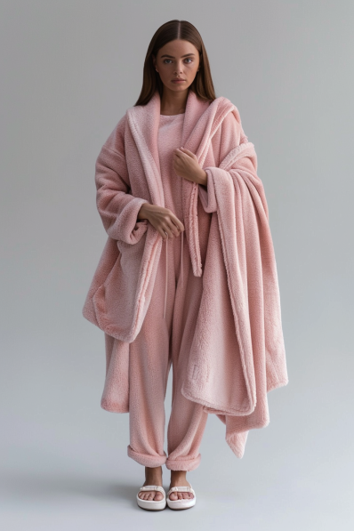 A plush loungewear set in a dreamy blush pink shade, complete with a matching robe and blanket, is the ultimate definition of comfort. The soft, fuzzy fabric wraps you in warmth, making it perfect for those chilly movie nights at home. Paired with cozy slide slippers, this outfit is all about embracing relaxation in style.