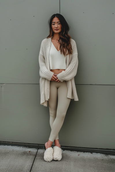 Neutral Knit Cardigan with Leggings and Cozy Slippers