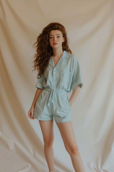 A lightweight button-up romper in a soft pastel shade brings effortless charm to a cozy movie night at home. The relaxed fit, cinched waist, and airy short sleeves create a flattering yet super comfortable silhouette. With its casual yet stylish vibe, this piece offers just the right balance between laid-back and cute, making it a perfect choice for lounging while still feeling put-together.