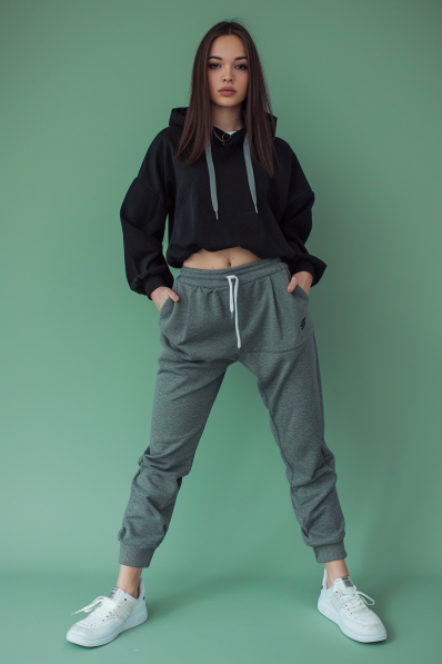 A cropped black hoodie paired with relaxed-fit joggers is the ultimate mix of comfort and effortless cool. The drawstring waist and cuffed ankles keep things snug, while the hoodie adds a sporty touch that’s perfect for a relaxed night in. Topped off with classic white sneakers, this outfit is all about casual vibes with just the right amount of edge.