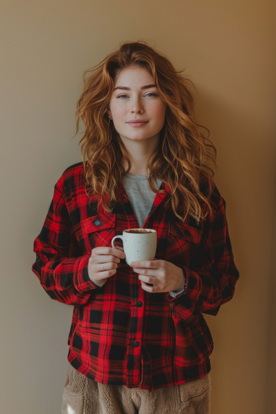 A red and black flannel shirt layered over a soft grey tee creates an effortlessly cozy look, perfect for a relaxed movie night at home. Paired with plush, textured lounge pants, this outfit is all about staying warm and comfortable without sacrificing style. The flannel’s bold pattern adds a touch of rustic charm, while the neutral layers underneath keep things balanced.
