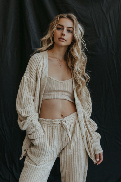 A soft ribbed knit lounge set in a warm, neutral shade creates the perfect blend of comfort and understated elegance. Featuring a relaxed cardigan, cozy drawstring pants, and a matching crop top, this outfit is both breathable and stylish. The textured fabric adds a subtle touch of sophistication, making it an easy choice for an at-home movie night that still feels put together.