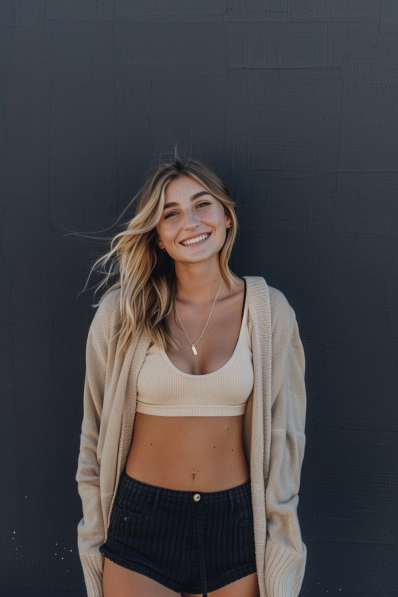 A relaxed beige cardigan layered over a ribbed crop top creates an effortlessly cool look, perfect for a cozy night in. Paired with high-waisted black shorts, this outfit strikes a perfect balance between comfort and casual chic. The soft knit cardigan adds warmth, while the crop top and shorts keep things light and breezy, making it an ideal choice for a laid-back movie marathon.