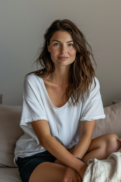 An oversized white tee paired with comfy black lounge shorts creates the perfect effortless look for a cozy movie night at home. The relaxed fit of the shirt brings an easygoing vibe, while the soft shorts keep things comfortable without feeling too casual. It’s a simple yet stylish combination that makes you feel relaxed and put-together at the same time.
