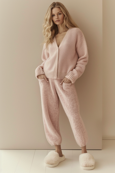 A dreamy knit set in soft pastel pink brings the ultimate cozy vibes for a relaxed movie night at home. The oversized cardigan paired with matching knit joggers offers a chic yet laid-back feel, while the plush texture adds an extra touch of warmth and comfort. Finishing off the look with fluffy slippers makes this outfit perfect for lounging in style.