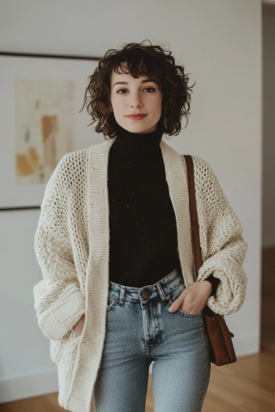 This outfit is all about effortless winter comfort while staying chic. The oversized cream-colored cardigan is a perfect layering piece over the fitted black turtleneck, giving that lovely mix of cozy and streamlined. Paired with light blue high-waisted jeans and a classic brown leather shoulder bag, it creates a laid-back vibe that’s perfect for a casual winter date night. The soft knit contrasts beautifully with the structured denim, adding texture to the look.