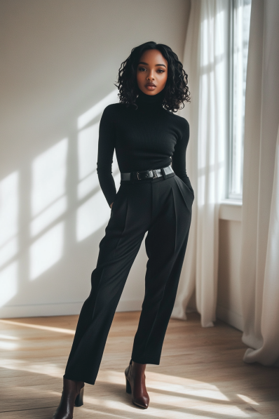 Sleek All-Black Turtleneck and Tailored Trousers