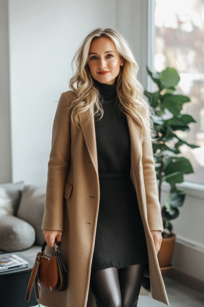 This look blends timeless elegance with cozy comfort, making it a perfect choice for a winter date night. A fitted black sweater dress pairs beautifully with a classic camel coat, creating a chic yet understated silhouette. The addition of black leather leggings underneath adds a sleek touch, while the structured brown handbag brings just the right amount of contrast. It’s a look that is both warm and stylish, ideal for those colder evenings when you still want to feel polished.