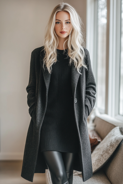 This monochromatic outfit is a perfect balance between sleek and cozy. The long, black wool coat drapes effortlessly over a ribbed knit sweater dress, creating a streamlined silhouette that’s both warm and sophisticated. Paired with black faux-leather leggings, this look adds a modern, edgy twist to the classic all-black ensemble. It’s a go-to outfit for any casual winter date, whether you’re grabbing coffee or taking a nighttime stroll.