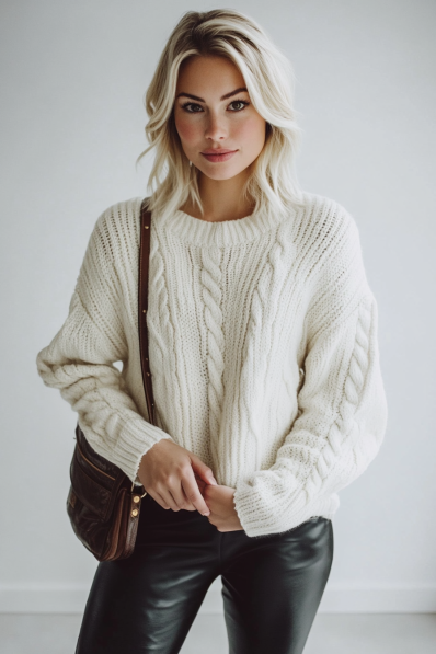 This outfit strikes the perfect balance between cozy and chic, with an oversized cream cable knit sweater paired with sleek black faux-leather leggings. The textured knit adds warmth and softness, making it ideal for chilly winter nights, while the fitted leather leggings bring a stylish edge to the look. A brown leather shoulder bag adds a subtle contrast, completing the outfit with an effortless vibe.