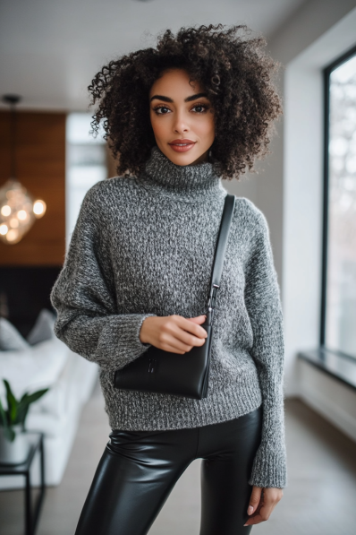 This look blends comfort and modern style seamlessly. The chunky grey turtleneck sweater offers a warm, snuggly feel, perfect for winter date nights, while the black faux-leather pants bring a touch of edge and sophistication. The addition of a simple black crossbody bag keeps the vibe minimal and polished, making this outfit a versatile choice for almost any casual winter date setting.