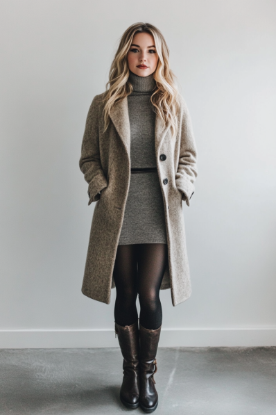 This look is the ultimate in cozy sophistication. The soft grey turtleneck sweater dress fits snugly, offering warmth while maintaining a sleek silhouette. It’s layered under a light taupe wool coat that adds extra warmth and a touch of elegance. The black tights and brown leather boots ground the outfit, bringing both comfort and style. The neutral tones create a refined, polished look that’s perfect for a casual winter date night.