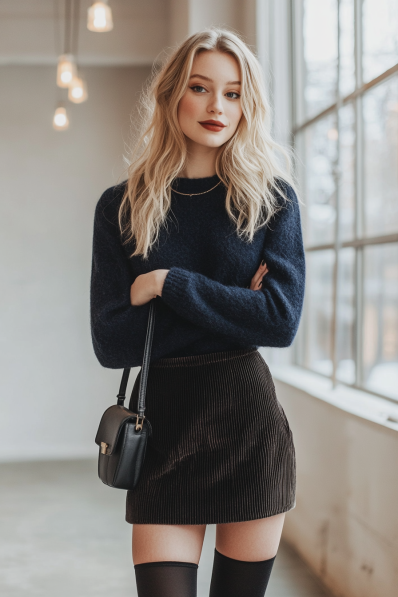 This look is the perfect blend of soft textures and sleek style. The navy knit sweater is cozy but fitted enough to keep things polished, while the black velvet mini skirt adds a luxurious feel with its subtle shine and texture. The over-the-knee socks and a classic black crossbody bag tie the outfit together, giving it a balanced mix of comfort and elegance. It’s ideal for a casual winter date night, especially if you’re aiming for that effortlessly chic vibe.