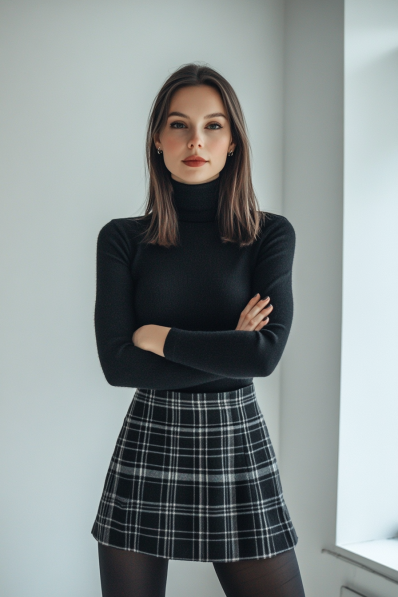Sleek Turtleneck and Plaid Skirt Combo