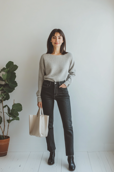 This look keeps it simple yet stylish, with a grey knit sweater tucked into high-waisted black jeans. The straight-leg jeans paired with sleek black ankle boots create a classic silhouette that’s both comfortable and flattering. The neutral tones give off an understated, effortlessly cool vibe, and the light beige tote bag adds a soft contrast to the darker outfit. This is the kind of outfit that says “I didn’t try too hard, but I still look fabulous.”