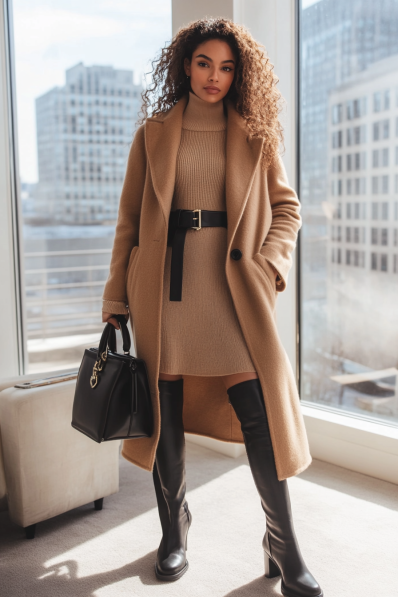 This outfit is an absolute show-stopper for a winter date night! The sleek camel-colored coat layered over a matching knit turtleneck dress exudes sophistication and warmth. The black belt at the waist defines the silhouette, giving a chic touch to the cozy ensemble, while the knee-high black boots add a bit of edge. Paired with a structured black handbag, this look perfectly balances comfort with city-ready glamour, making it ideal for those nights when you want to feel a little extra special.