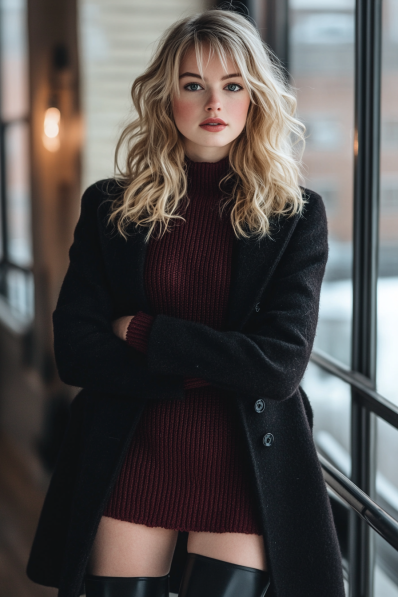 This outfit blends cozy with daring in all the right ways. A deep burgundy knit mini dress brings warmth and color to the look, while a sleek black overcoat adds an element of chic sophistication. The black thigh-high boots are a bold statement, adding both edge and warmth for those chilly winter nights. It’s a perfect combination of understated elegance with a touch of sass, making it ideal for a date night where you want to turn up the heat while staying warm.