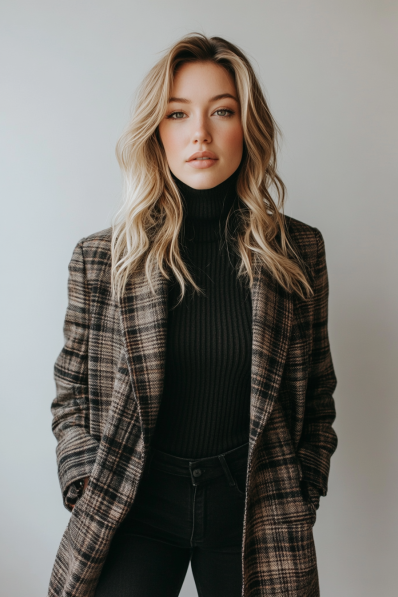 What I really love about this look is how it feels both classic and modern at the same time. The plaid coat gives that cozy, winter vibe we all crave, but pairing it with an all-black outfit underneath keeps things looking sharp and put-together. It’s ideal for those winter evenings when you want to stay warm but still feel fashionable. Plus, you can never go wrong with a turtleneck and tailored coat combo — it’s practically foolproof for any date night!