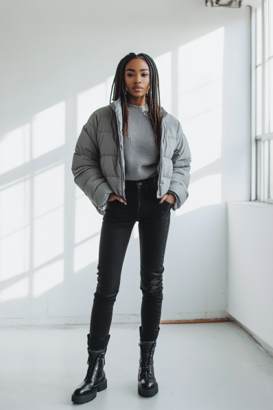 This look combines practicality with a little edge, making it a great option for a casual winter date night. A grey puffer jacket is layered over a simple grey knit sweater, keeping things warm and comfy. The high-waisted black skinny jeans provide a sleek contrast, and the chunky black lace-up boots add a touch of boldness to the outfit. It’s minimal, monochrome, and effortlessly cool — perfect for when you want to stay warm without sacrificing style.