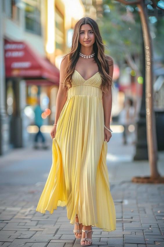 This dress is the definition of effortless elegance. The soft yellow hue feels like pure sunshine, while the flowing pleats add movement and grace to every step. Thin straps and a subtly ruched bodice create a flattering fit, and the delicate pearl accessories bring a touch of sophistication. Paired with strappy sandals, this look is breezy, feminine, and undeniably chic.