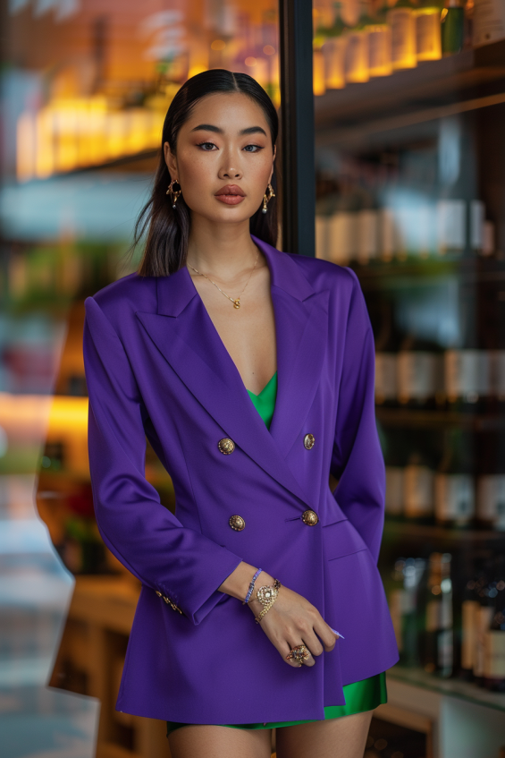 This outfit is all about powerful color contrast. A structured purple blazer with gold buttons brings a sophisticated edge, while the vibrant satin green mini dress underneath adds a sultry, playful twist. The combination of sharp tailoring and flowing fabric creates a perfect balance of polished and fun. Delicate gold jewelry and sleek hair complete the modern, fashion-forward look.