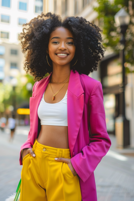 This outfit is a total power move. A bold hot pink blazer adds instant confidence, while the mustard yellow high-waisted trousers bring a stylish, unexpected contrast. A simple white crop top keeps the look fresh and balanced, letting the vibrant colors shine. Gold accessories and a sleek handbag tie it all together for an effortlessly chic city-ready vibe.