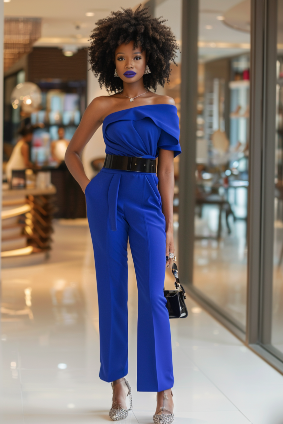 This outfit is pure power dressing with a glamorous twist. The striking royal blue jumpsuit features an elegant off-shoulder design with structured ruffles that add a touch of drama. A sleek black belt cinches the waist, creating a sharp silhouette, while tailored trousers keep the look polished. Paired with sparkling heels, statement earrings, and a chic mini bag, this look is confidence in clothing form.