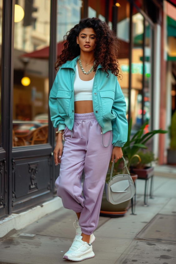 This outfit is athleisure at its finest. A cropped turquoise jacket adds a trendy street-style vibe, while the lilac joggers keep things relaxed and effortlessly cool. A crisp white crop top balances out the look, and chunky sneakers make it perfect for all-day comfort. Silver accessories and a structured mini bag bring just the right amount of polish to this laid-back ensemble.